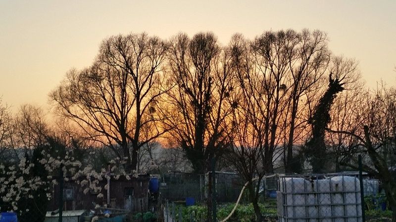 Ce soir, on a eu, comme tous les soirs, un très beau coucher de soleil sur les jardins ouvriers, le chant des oiseaux égaye le printemps qui vient.